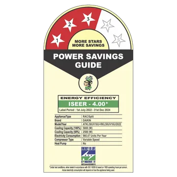 - Energy Rating: 3 star; ISEER- 4; Annual Energy consumption 966KWh