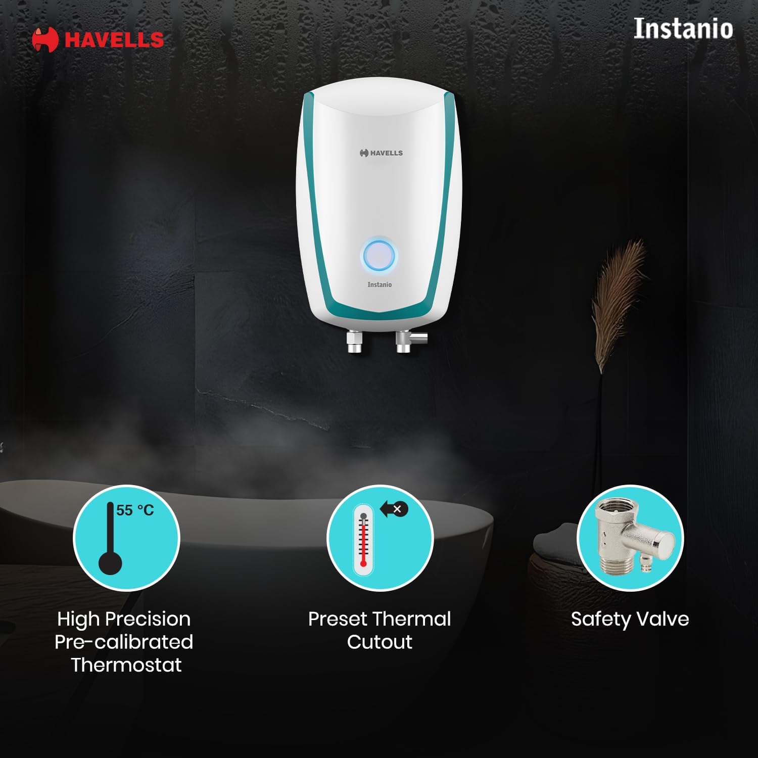 Havells Instanio 3L Instant Water Heater(Geyser)| Temp. Sensing LED Indicator| Rust & Shock Proof Body| ISI Marked|Warranty: 5 year on Inner Tank| High Rise Compatible (White Blue)