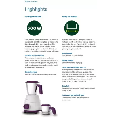 Compact and Stylish Design: With its stylish White and Purple finish, the Philips HL7506/00 adds a touch of elegance to your kitchen. Its compact design ensures it doesn't take up too much space on your countertop, making it suitable for smaller kitchens.