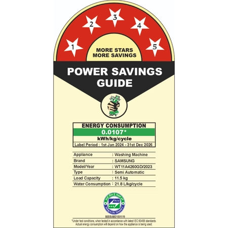 Spend less on bills and protect the planet. The washing machine’s high energy efficiency is certified by the Bureau of Energy Efficiency (BEE) with its highest “5 star” rating.