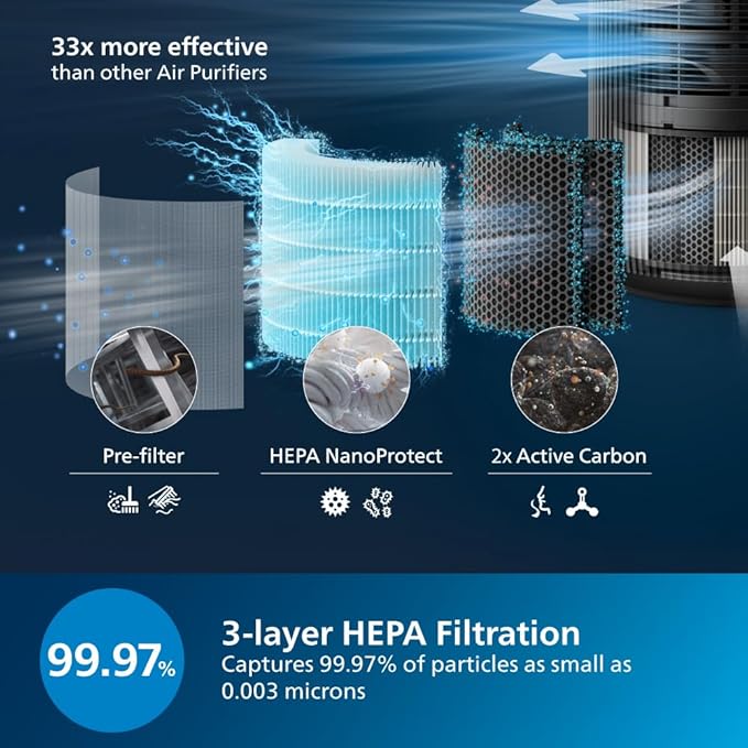 - 4-LAYER HEPA FILTRATION: 4-layer filtration made of pre-filter, HEPA NanoProtect and double Active Carbon layer captures 99.97% of particles as small as 0.003 microns (PM0.003)-– to protect from pollen, dust, pet dander, smog or gases and viruses