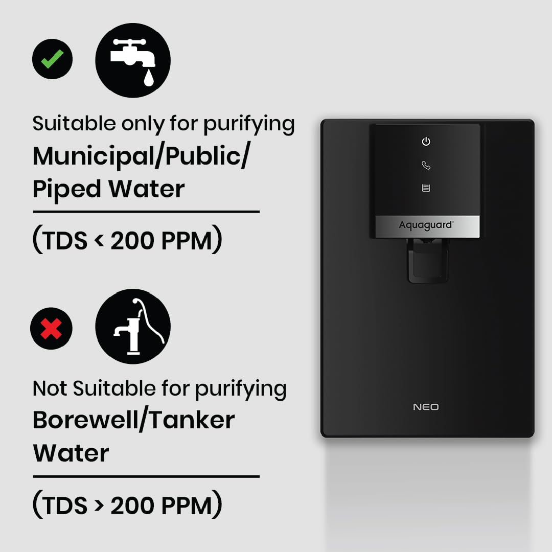 - Water Suitability- This product is ONLY SUITABLE for Municipal/ Public/ Piped water (TDS <200 PPM) & NOT SUITABLE for Borewell/ Tanker Water (TDS > 200 PPM)