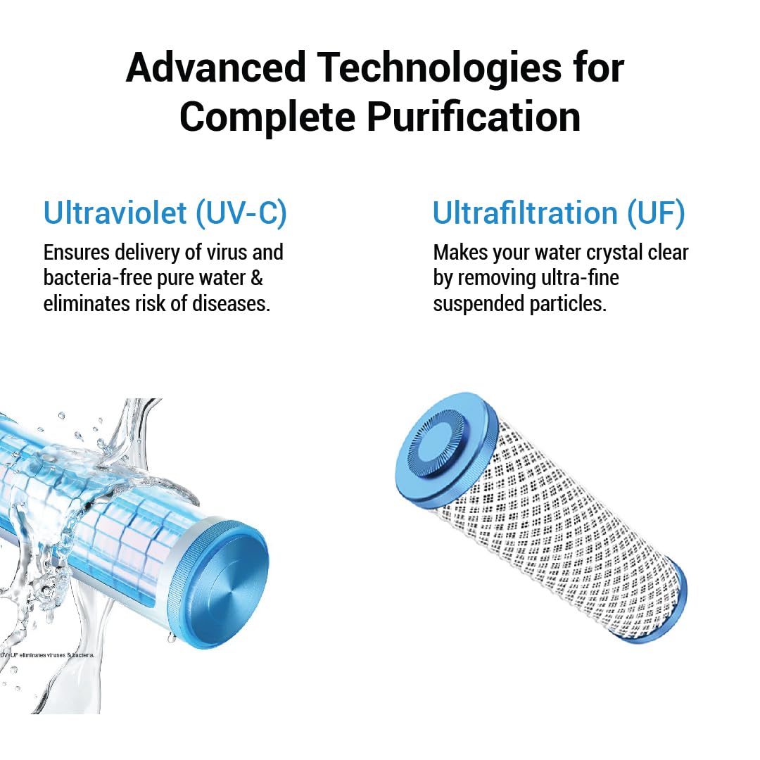 - Purification Process- UV e-boiling delivers water that is as safe and pure as water boiled for over 20 minutes. Ultrafiltration (UF) imparts crystal clear clarity to drinking water in addition to making it safe from viral and bacterial contamination
