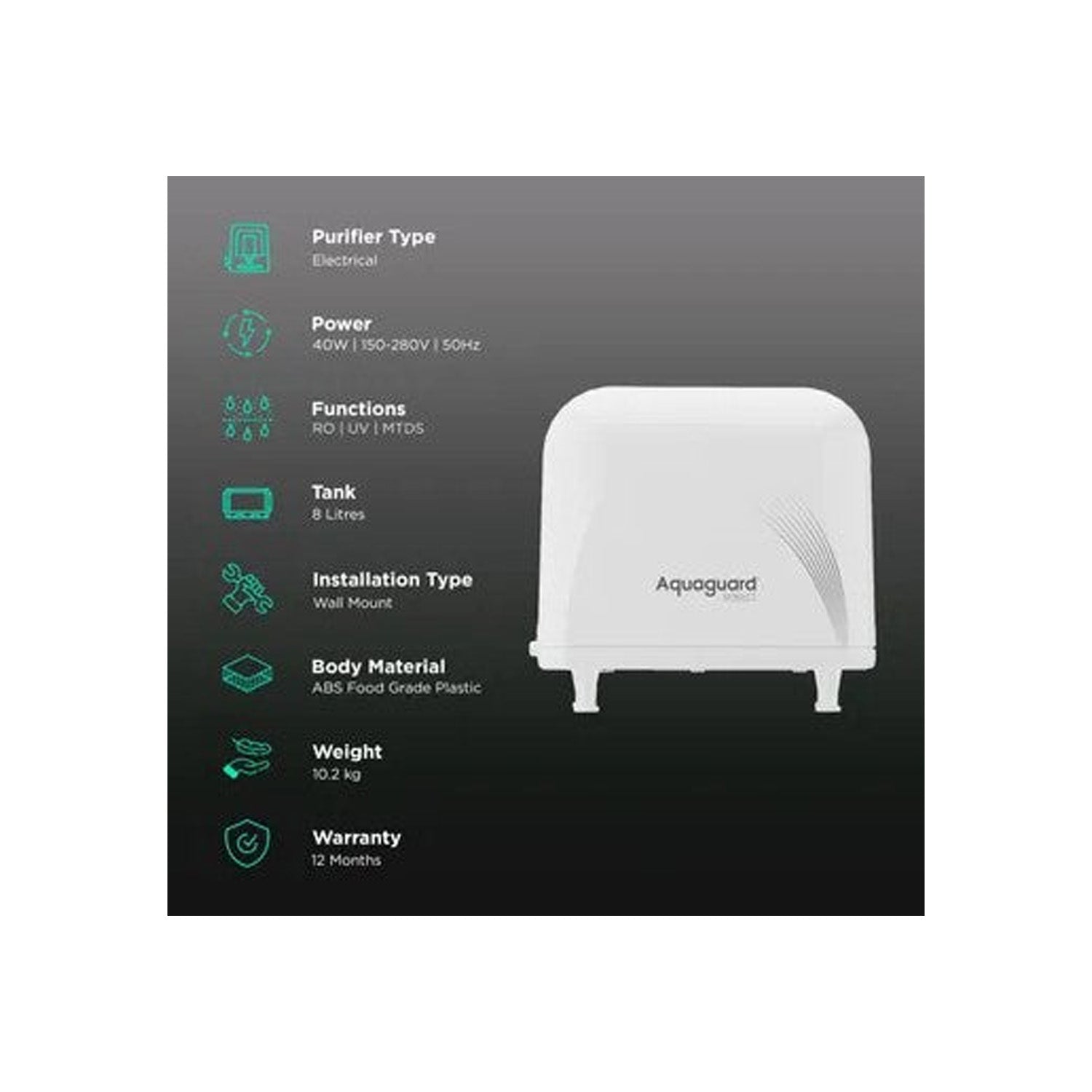 • Technology:RO+UV+MTDS 1)Aquaguard is the only certified brand that removes new age contaminants like lead, mercury & arsenic from the water while eliminating all viruses & bacteria.2)Unique UV e-boiling technology that makes your water as safe and pure as the water boiled for 20+ minutes.3)The Taste Adjuster allows to adjust water taste as per the source, to always provide sweet tasting water