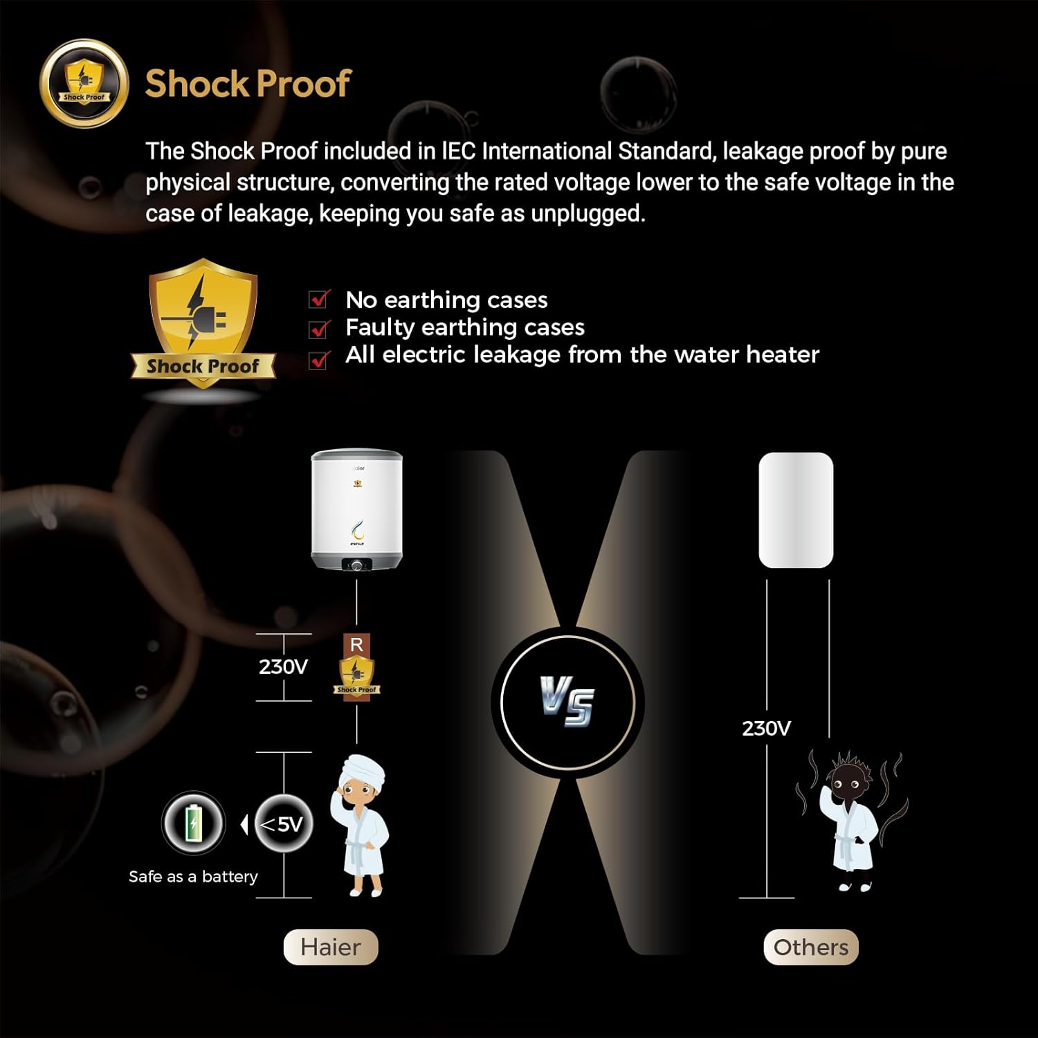 - Shock Proof: The Shock Proof included in the lEC International Standard, converts the rated voltage lower to the safe voltage in the case of leakage, keeping you safe as unplugged.
