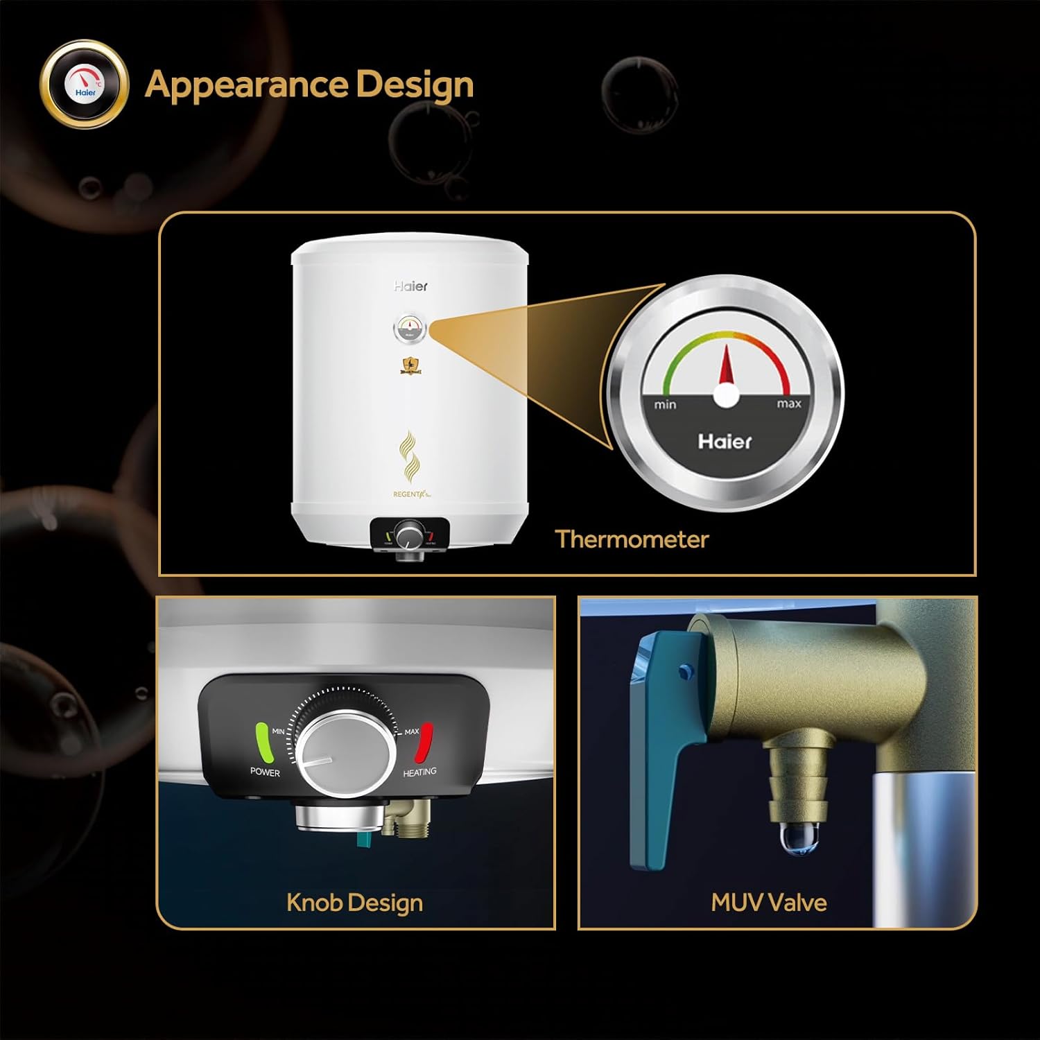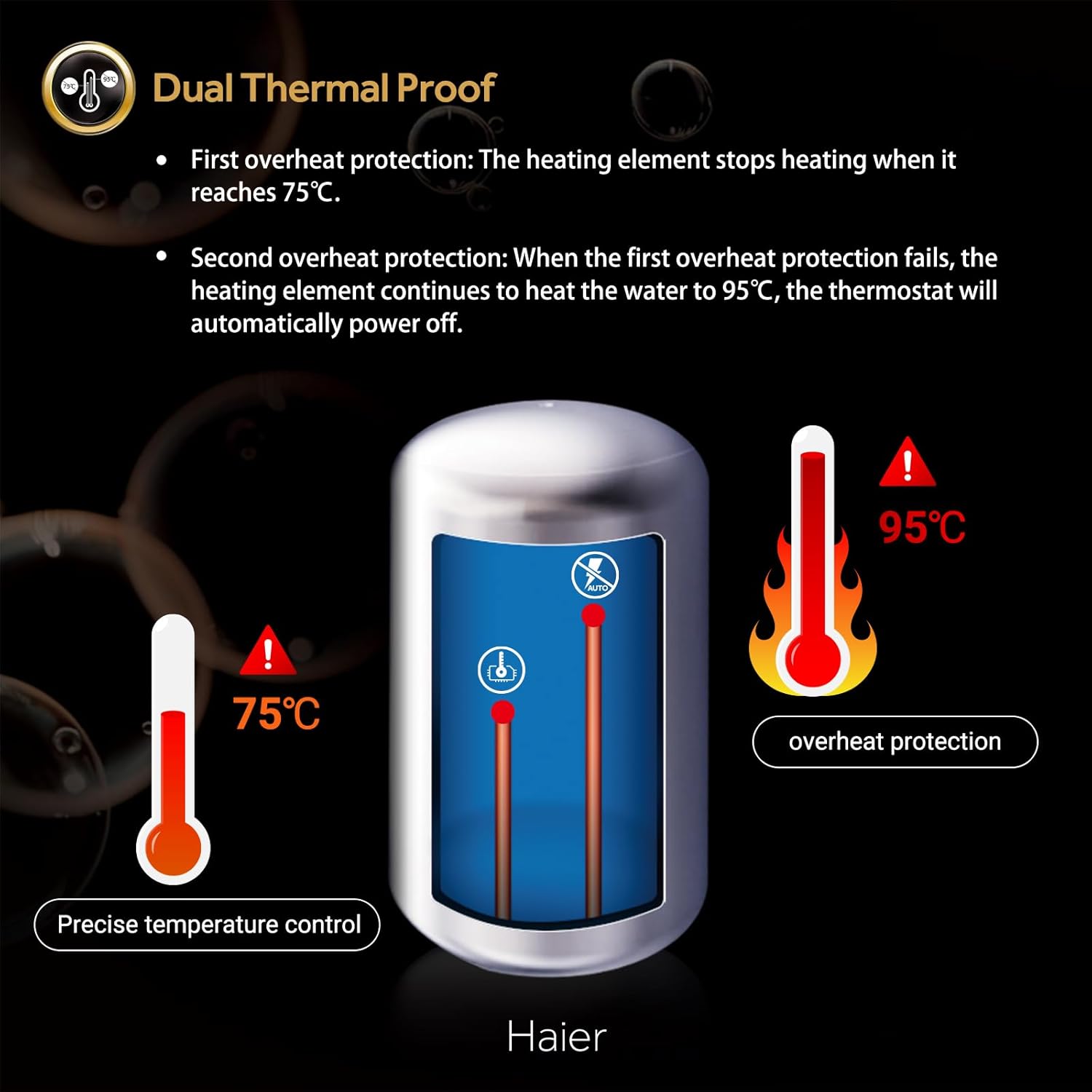 - Dual Thermal Proof (TTS): First overheat protection: The heating element stops heating when it reaches 75°C. Second overheat protection: When the first overheat protection fails, the heating element continues to heat the water to 95°C, the thermostat will automatically power off.