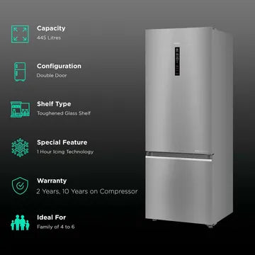 Haier 445 Litres 2 Star Frost Free Double Door Bottom Mount Convertible Refrigerator with Triple Inverter Technology HRB-4952BIS-P, Inox Steel