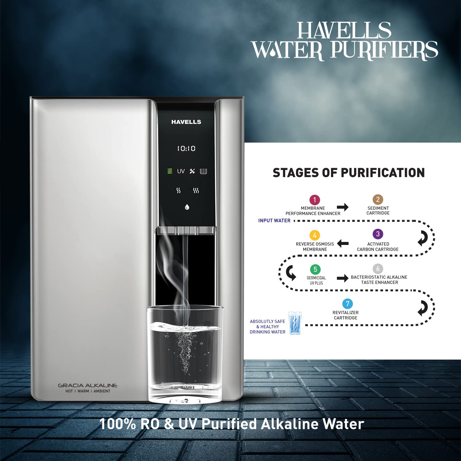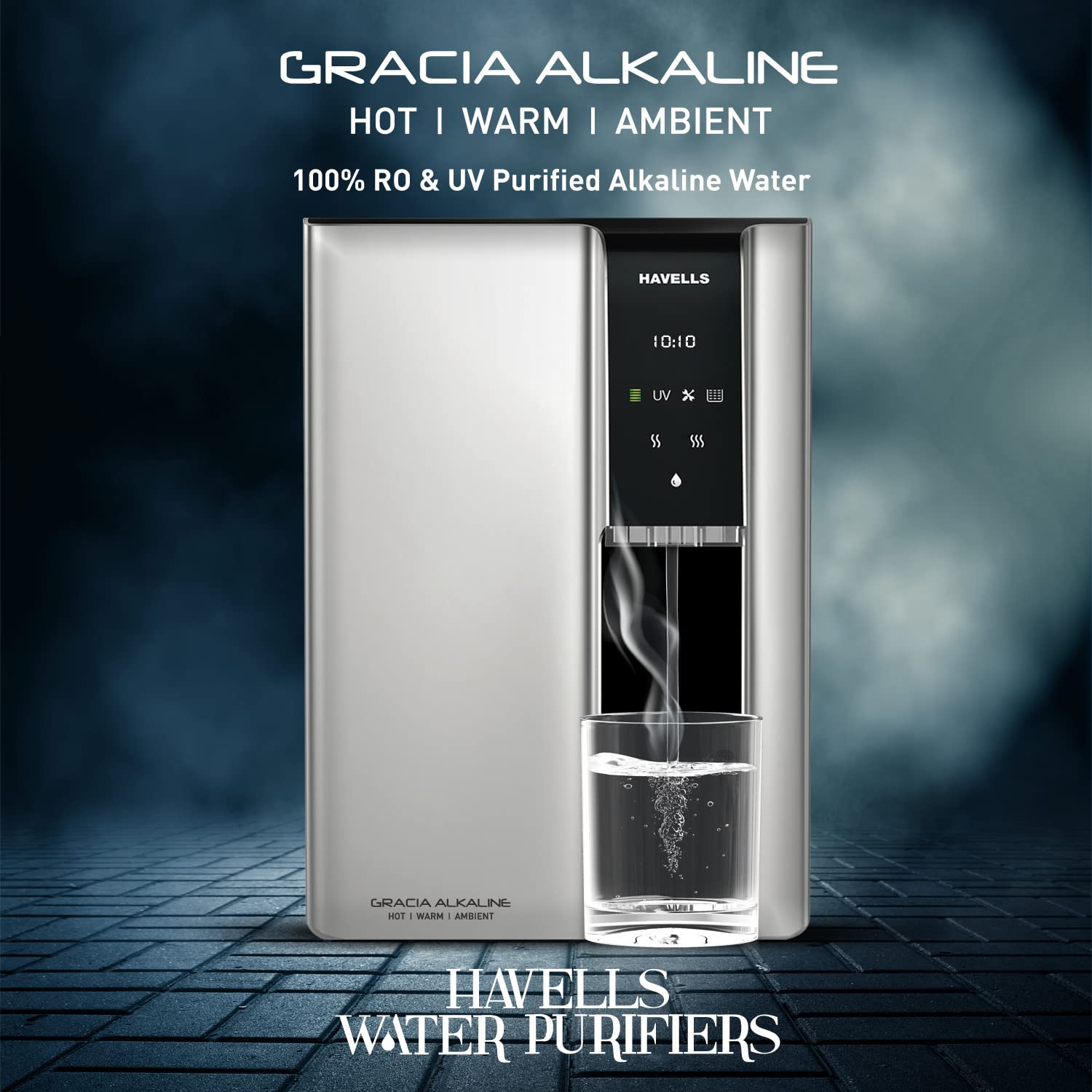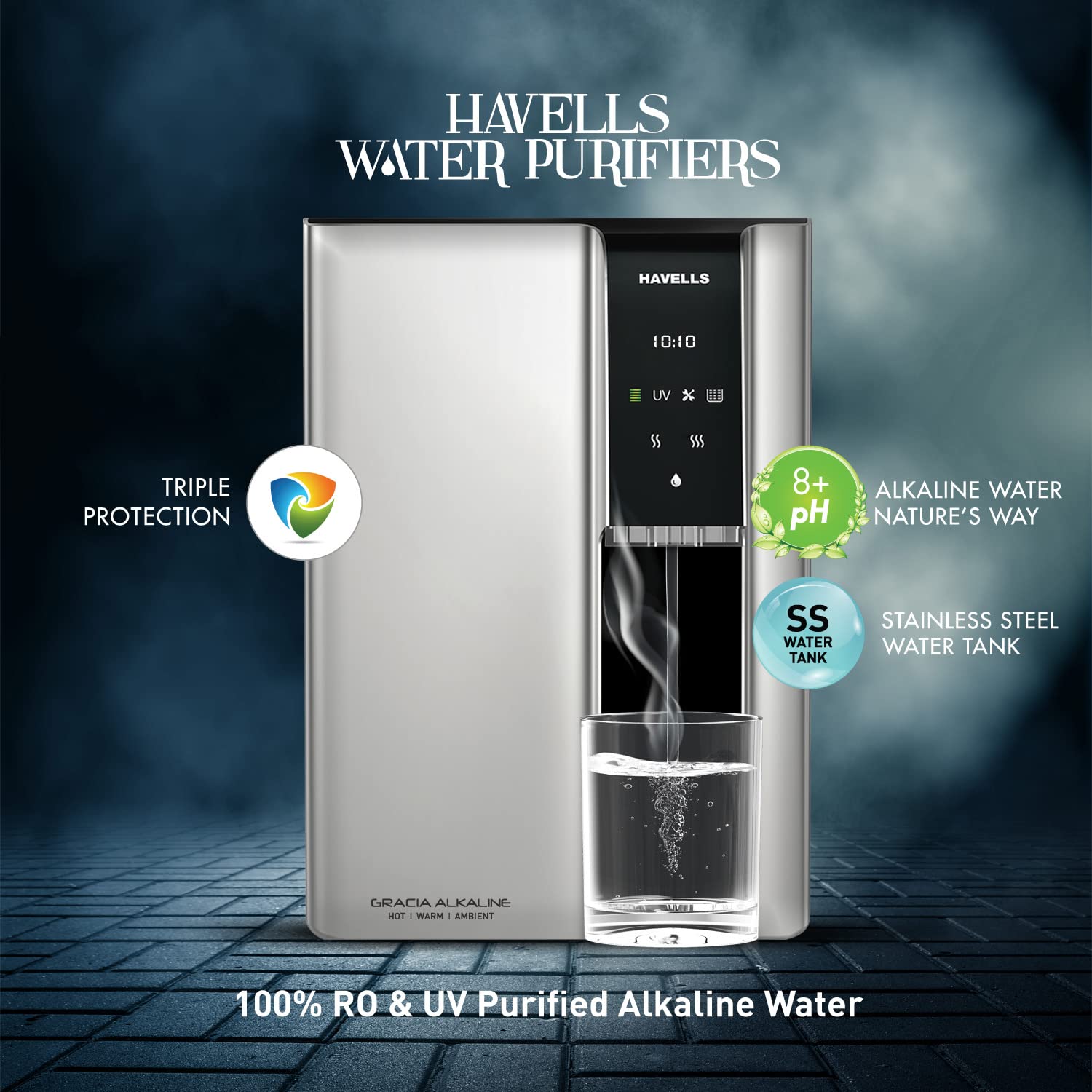 Havells Gracia Alkaline Water Purifier (Silver & Black), RO+UV+Alkaline, Hot, Warm & Ambient Water, Copper+Zinc, 8 Stage Purification, 7.5L SS Tank, Suitable for Borwell, Tanker & Municipal Water