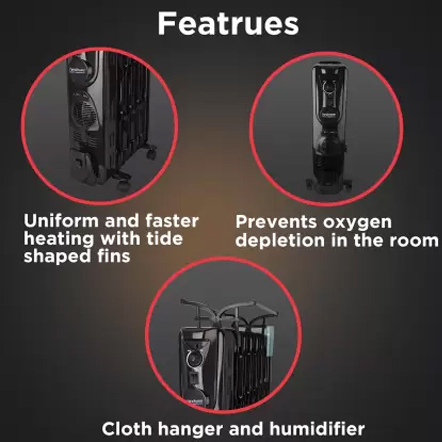 You can maintain a comfortable room temperature with the Hindware Atlantic Velda Oil Filled Room Heater. Thanks to its castor wheels, you can move this room heater from one room to another effortlessly. And, it maintains optimum oxygen levels in the room while also providing effective heating. In addition, the tide-shaped fins of this room heater facilitate rapid heat delivery. Moreover, integrated with a tip-over protection feature, this appliance automatically shuts off in case of accidental falls to ensure your safety.