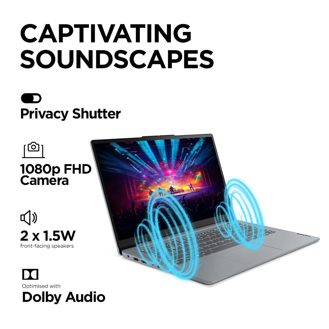 With its narrow bezels and stunning display, the IdeaPad Slim 3i Gen 8 is sure to turn heads—even while yours stays focused on the 39.62cms (15) high-def wide-angle view. TÜV Certified Low Blue Light helps avoid eye fatigue. What’s more, Dolby Audio™ ensures you’ll enjoy premium sound on a videocall, watching a movie, or just listening to your favorite tunes.