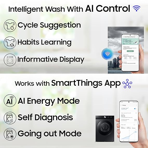 Samsung 12 kg, 5 Star, AI Ecobubble, Super Speed, Wi-Fi, Hygiene Steam with Inbuilt Heater, Digital Inverter, Fully-Automatic Front Load Washing Machine (WW12DB7B24GBTL, Black)