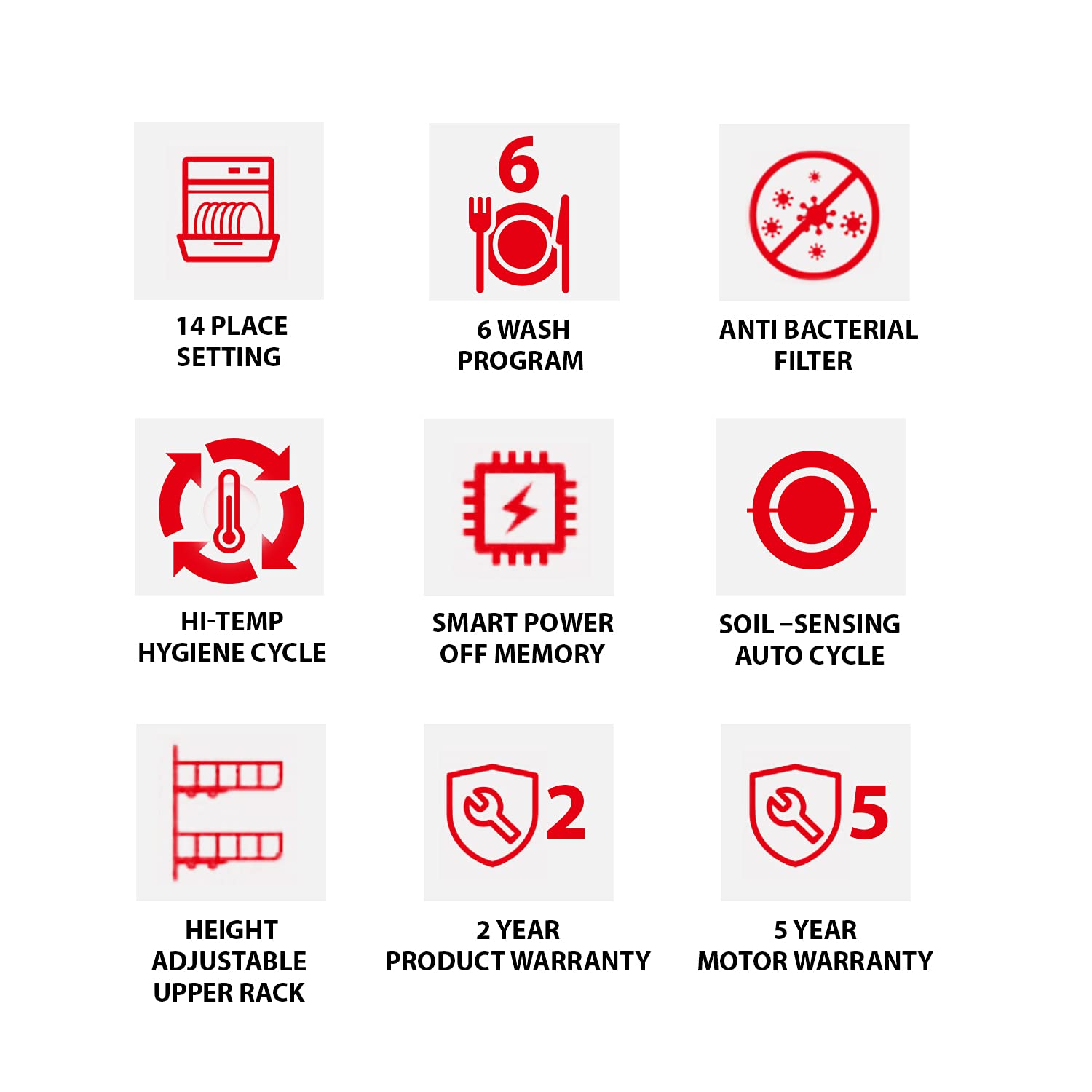 | Special Features | Half Load Option - A convenient and cost-effective solution for less tableware wash,, 3 Level Wash System, Free Finish Start Kit, Child Lock Protection, Energy Efficient Dishwasher with A++ Energy Efficiency |