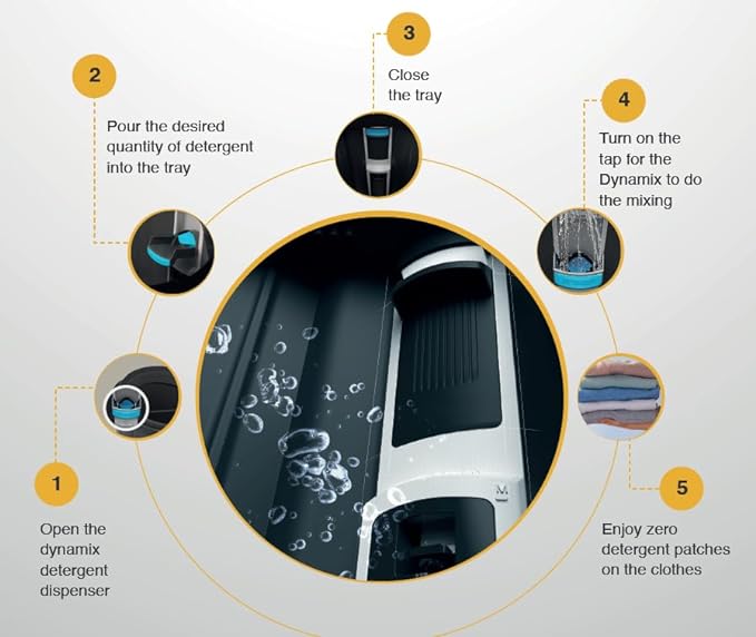 Hydrodynamic fins vigorously mix the detergent with water, ensuring no detergent coagulation and, hence, offering a supreme wash experience resulting in zero detergent patches.