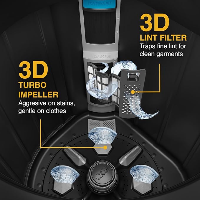 3D Turbo Impeller with rotary stem & 3D scrub pads provides perfect triple motion for clothes to remove dirt effectively.